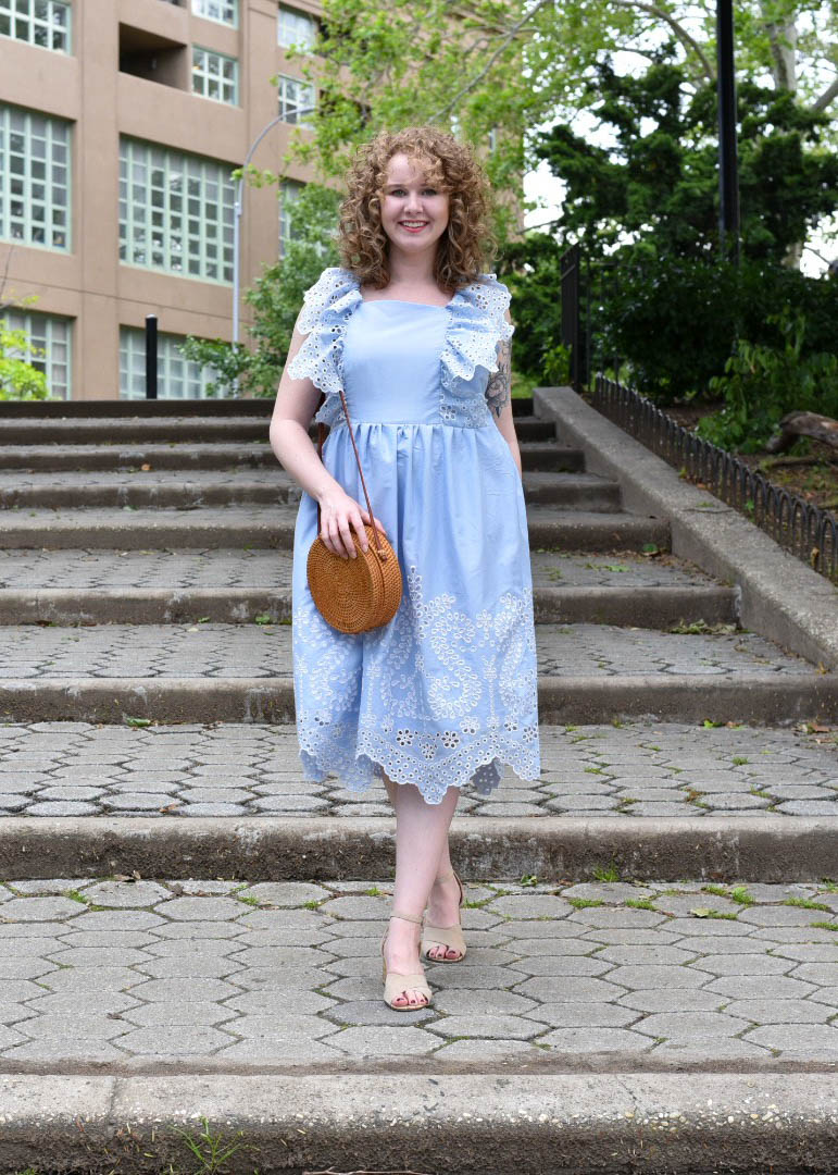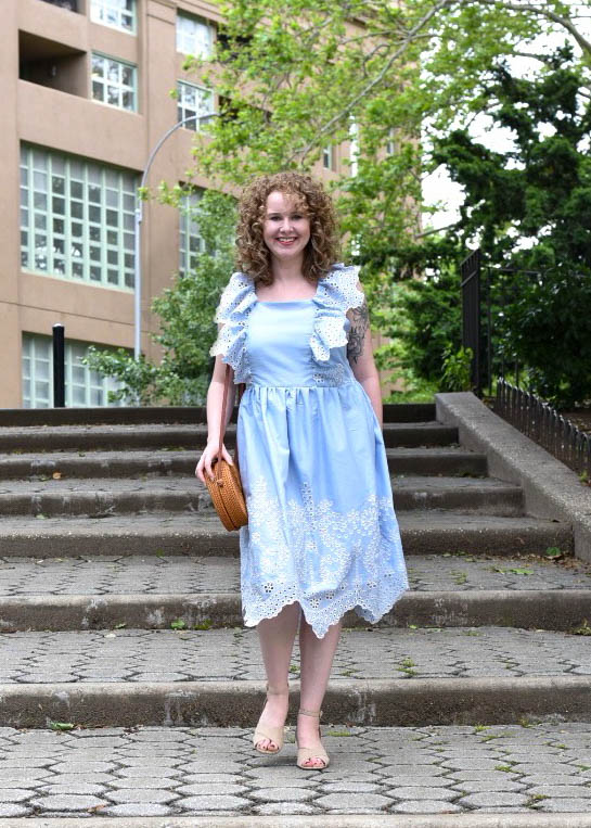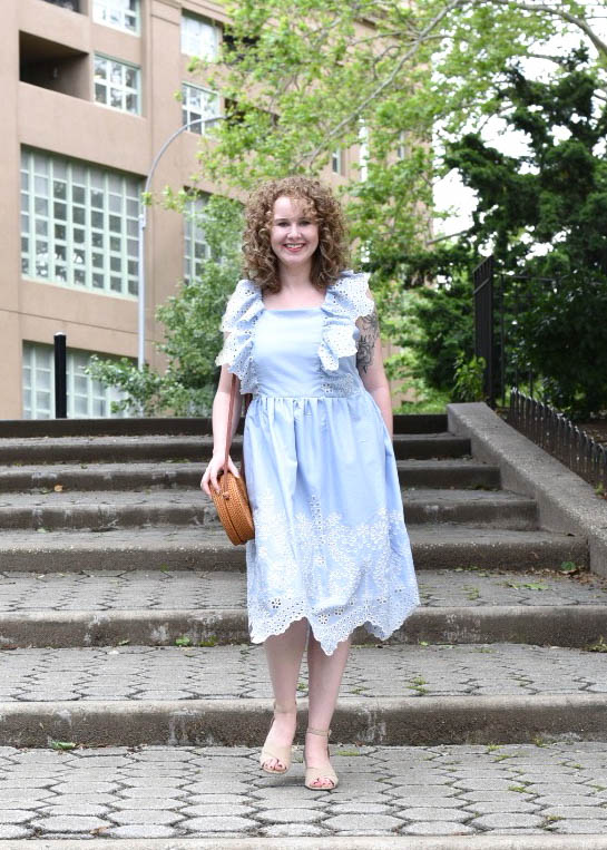 There are two length options: a midi and knee-length. I opted to make the midi length and shorten the dress to 26" as the pattern of my cotton voile fabric had a long scallop. The fabric comes from my stash, it is a lightweight and sheer blue cotton voile with a beautiful embroidered floral scallop design.