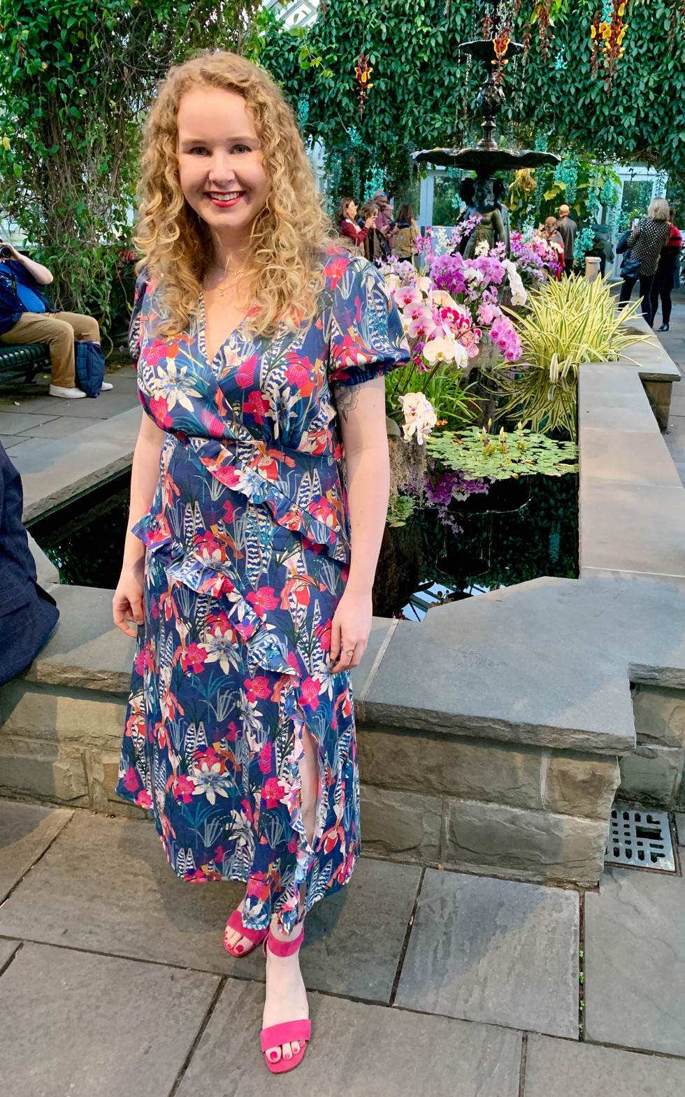 For this event I made McCall's pattern #M7894 view D. This dress pattern features a wrap-top bodice with an umpire waistline and a skirt with diagonal style lines and optional ruffles. View D has a long skirt with a slit and two ruffles going around the skirt in the front and back. The sleeves have an elastic insert and plenty of fullness.